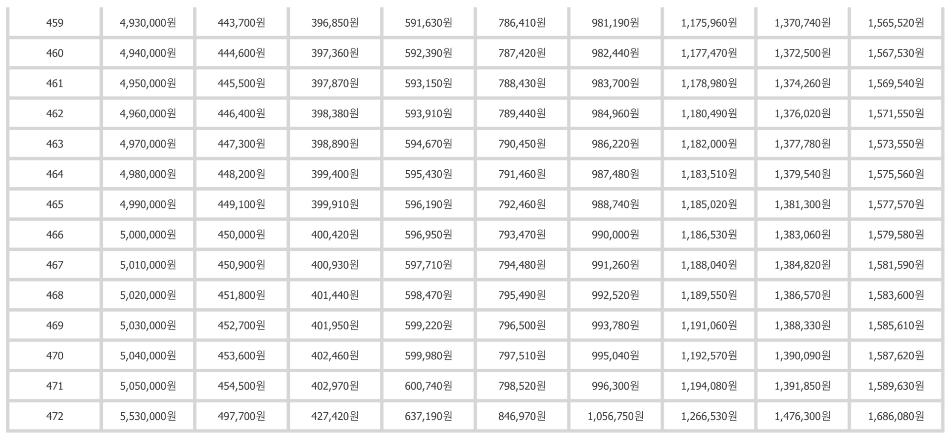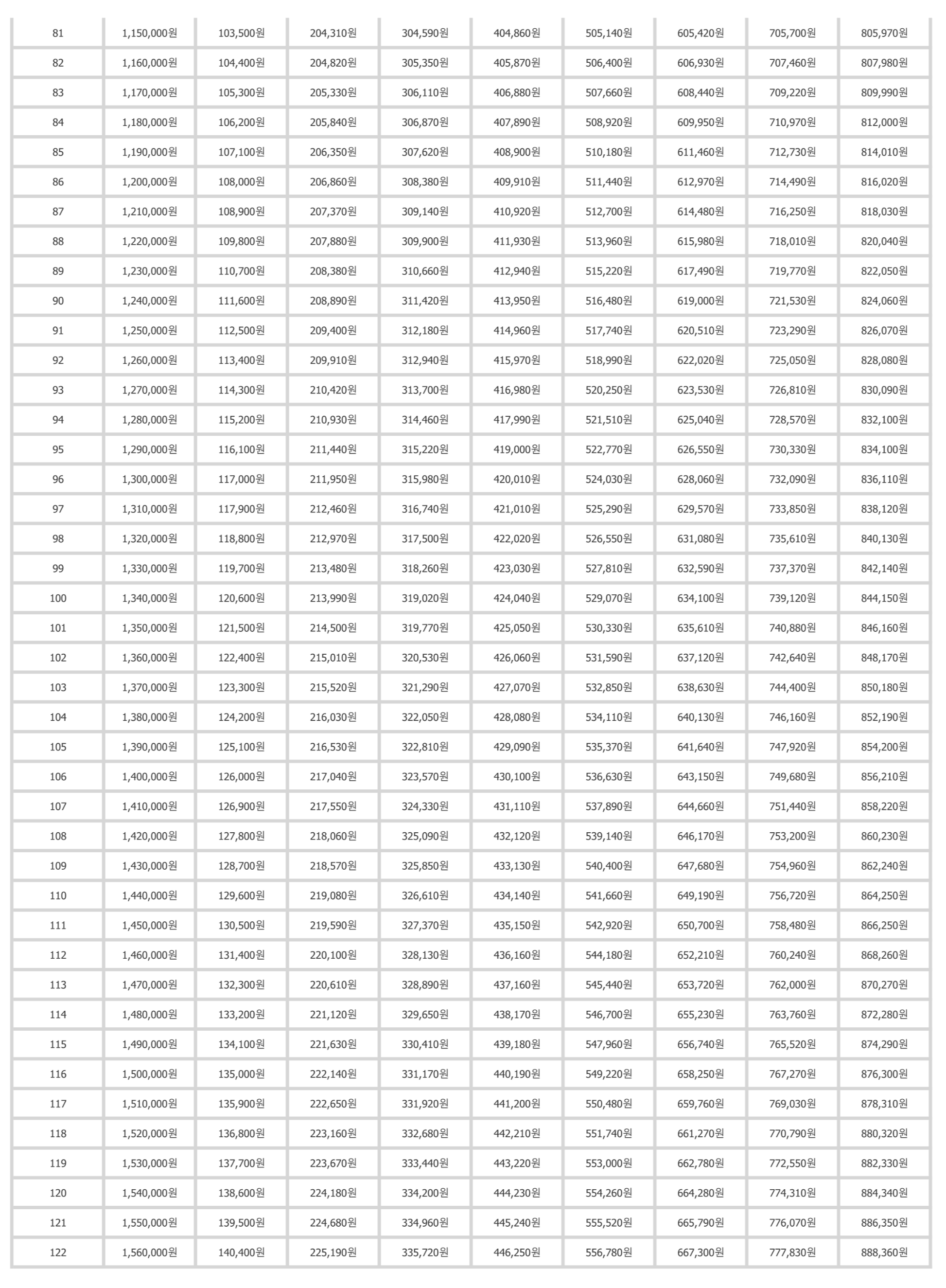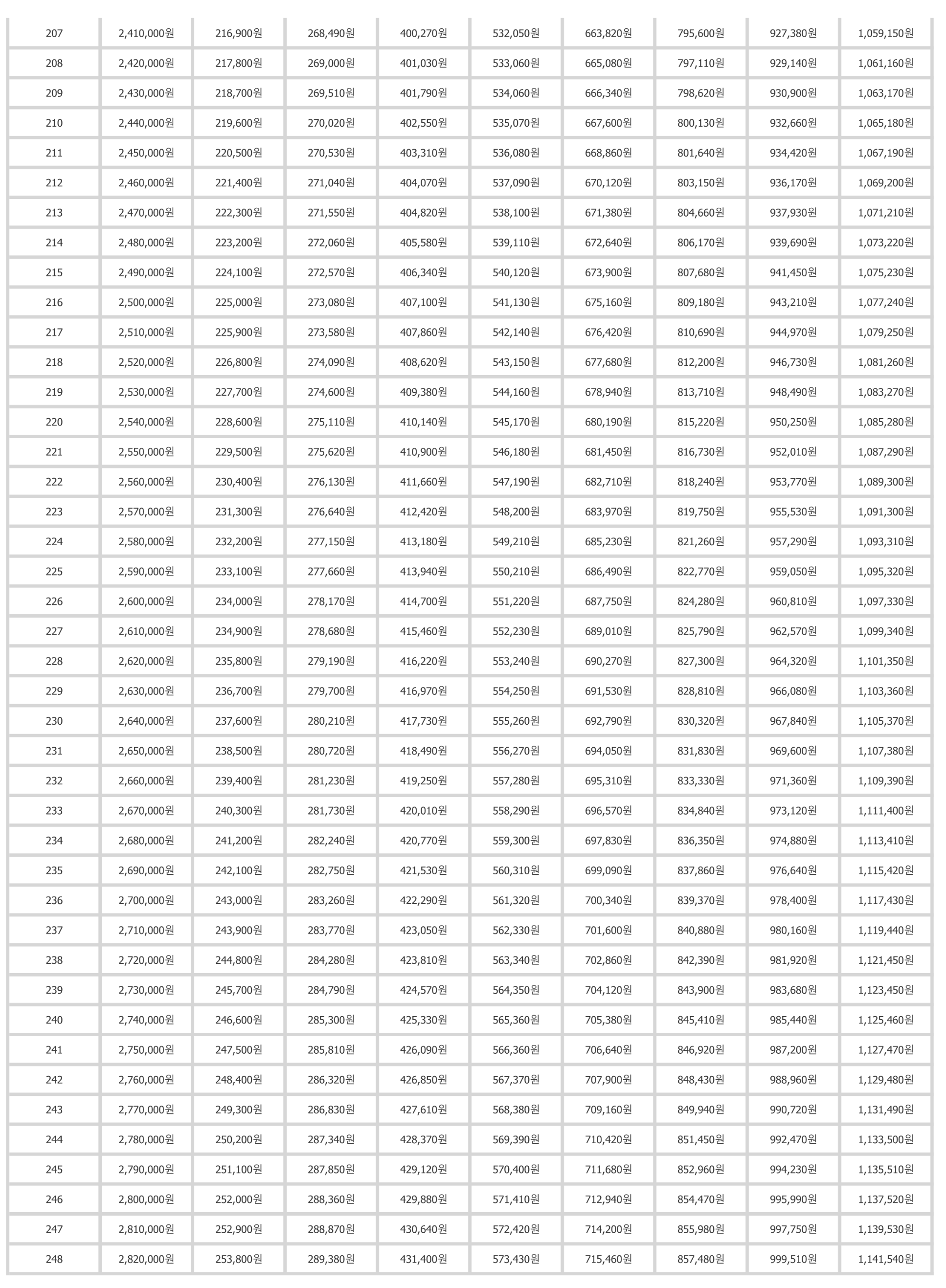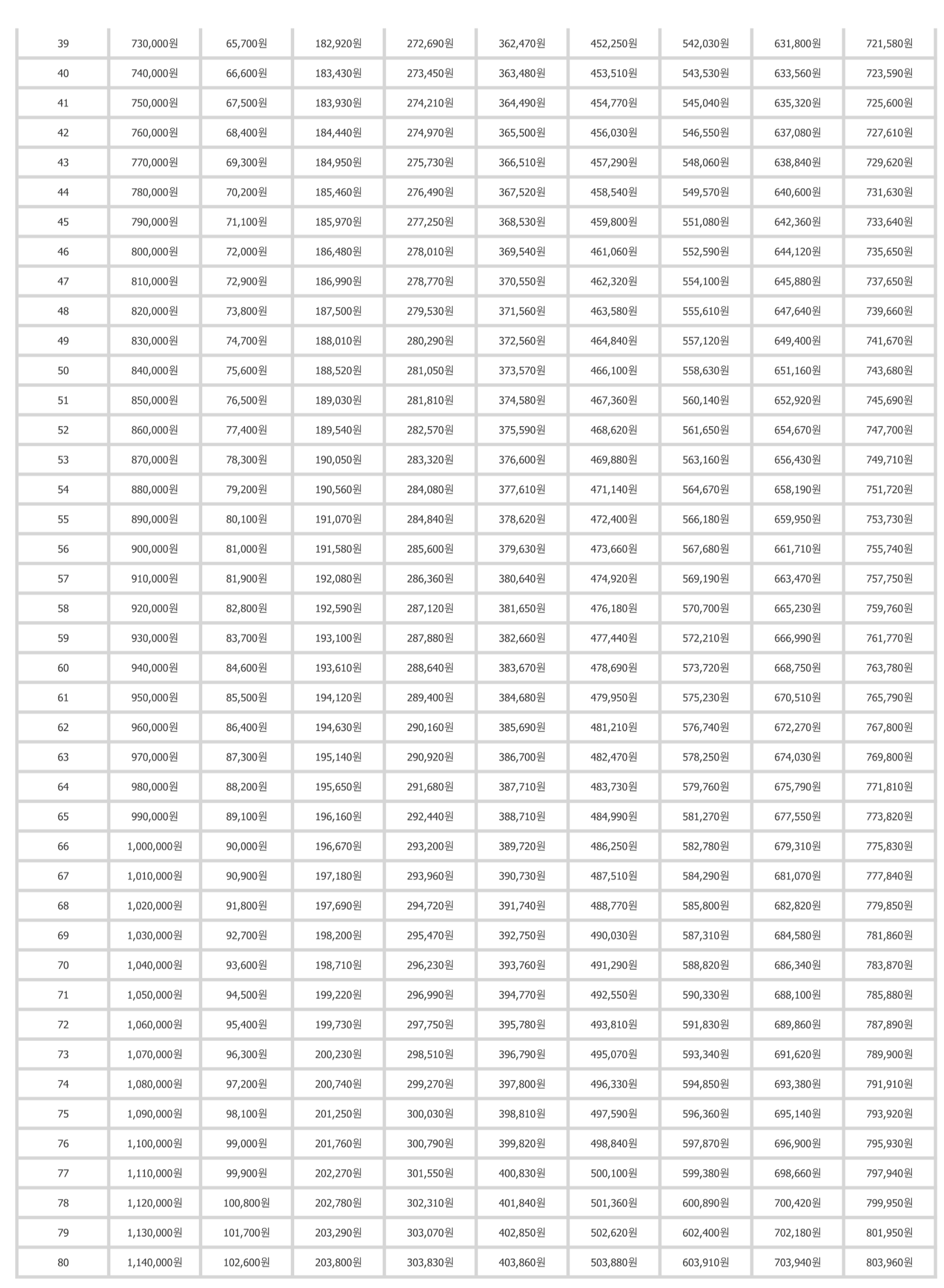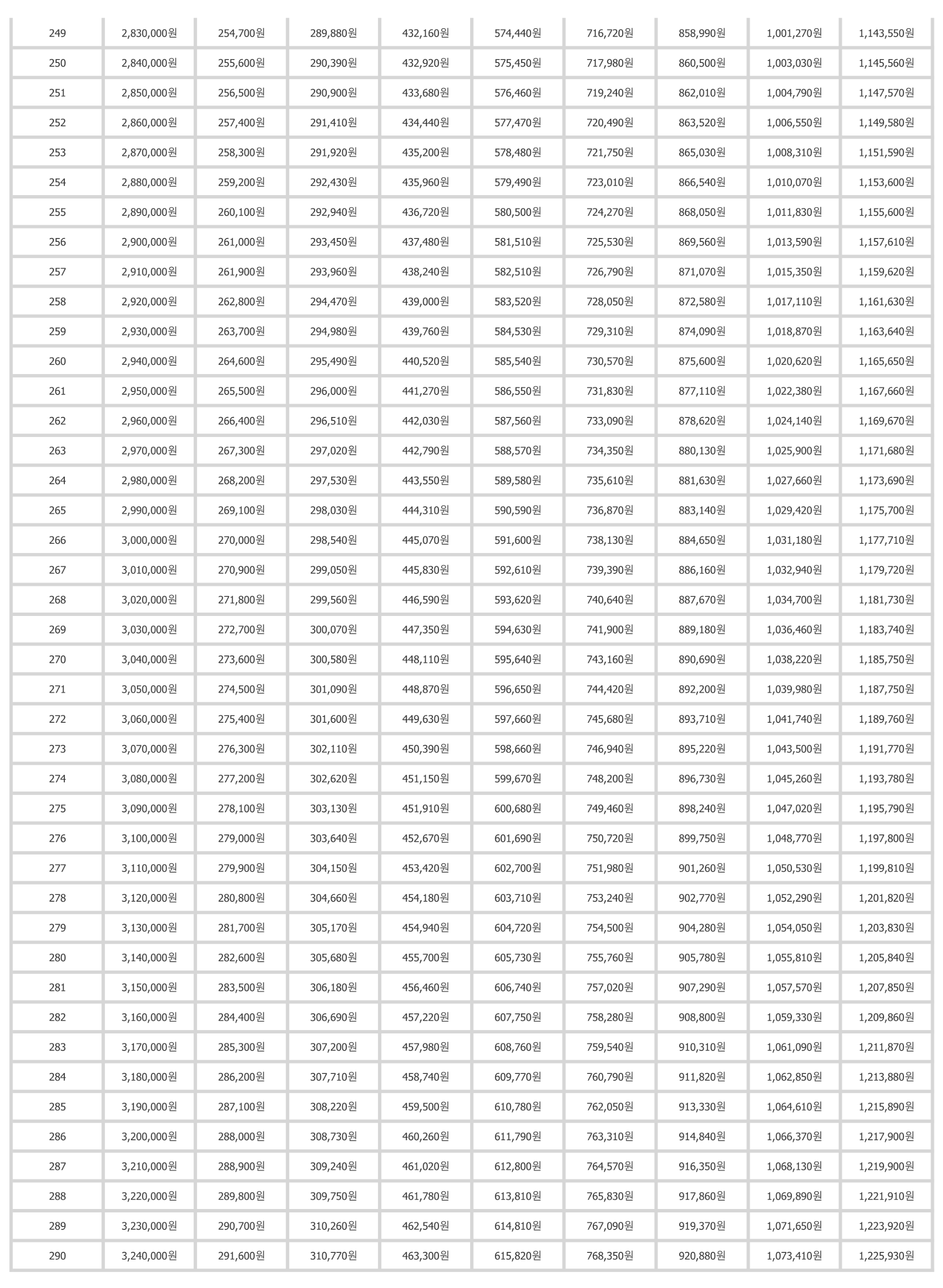 위의 표를 보기 어려우신 분들은 아래의 링크를 클릭하여 현재 납부하고 있는 보험료와 60세까지 총 국민연금 가입기간을 입력하면 간단히 모의계산도 가능하고, 간편 인증 등으로 로그인 시 예상 연금 수령액을 상세히 조회할 수 있습니다.