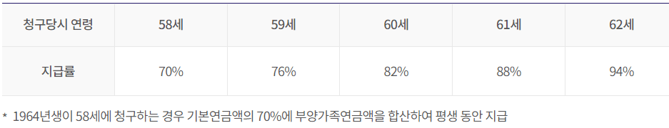 연령별로 지급나이가 다르겠지만, 1년에 6%씩 감소하는 것은 동일하기 때문에, 조기수령에 따른 지급률은 국민연금 수령나이 60세 기준으로 아래의 표와 같습니다.