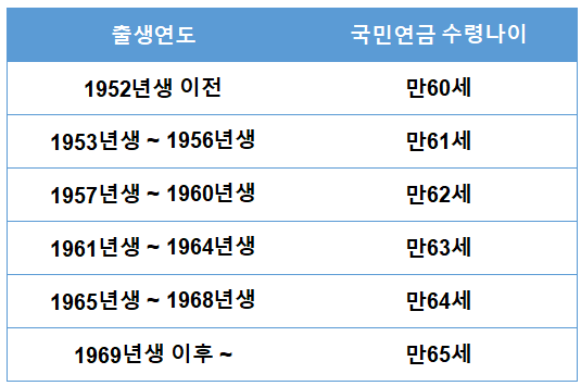 국민연금의 수령나이는 본인의 출생연도에 따라 달라집니다. 1953년 이전 출생자는 60세부터, 1953년 ~ 56년 출생자는 61세부터, 1957년 ~ 60년생 출생자는 62세부터, 1961년 ~ 64년 출생자는 출생자는 63세부터, 1965년 ~ 68년생 출생자는 64세부터, 1969년생 이후 출생자는 65세부터 국민연금을 받을 수 있습니다.