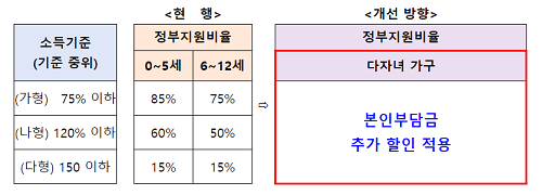 소득 기준에 대한 정부 지원 비율 확대와 영아 종일제 돌보미에 대한 추가 수당 지원을 검토하고 있습니다. 현행 부모가 모두 육아휴직 중인 경우 육아 공백이 인정되지 않아 아이돌보미 신청이 불가하였지만 다둥이 출산 가정의 경우에 한해 부모 모두 육아휴직 중이라도 아이돌보미를 지원받을 수 있도록 개선한다고 합니다.