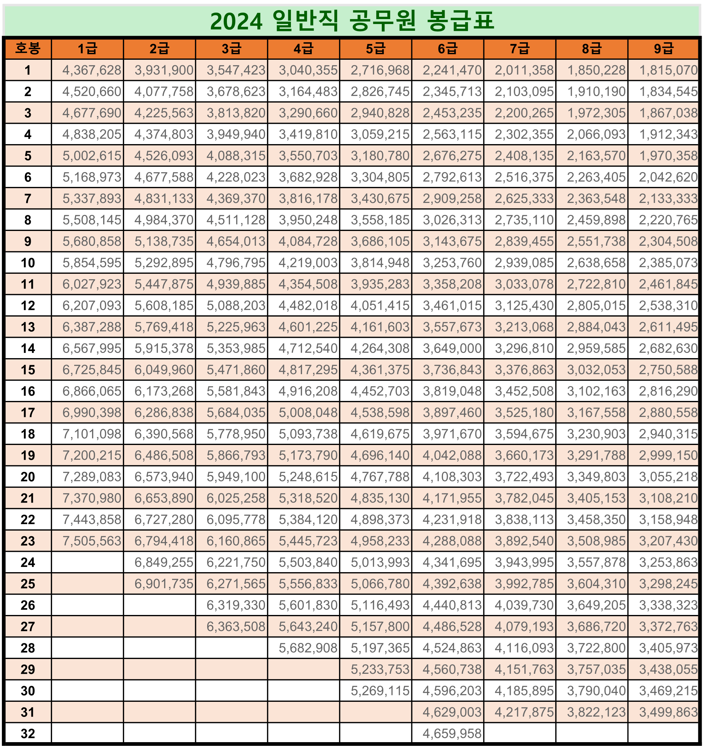 이 표는 일반직 기준이며, 교원, 경찰, 소방, 우정직 등의 특수직은 다른 호봉표가 적용됩니다. 또한, 이 표는 기본급만을 나타내며, 수당은 제외되어 있습니다..